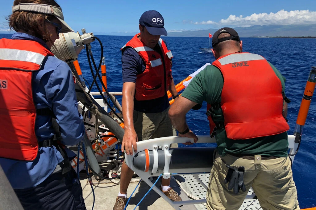 | El doctor Eric Attias i el seu equip desplegant el dispositiu de sonda electromagnètica de font controlada a la costa de Hawaii. |